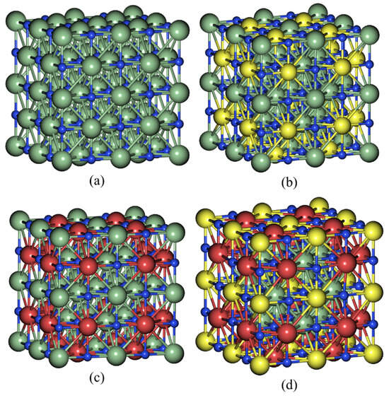 The 3D supercells of the alloyed samples: (a) YN (sample CY), (b) Y-N-Nb (sample CYN_3), (c) Y-N-Zr (sample CYZ_3), and (d) Y-N-Nb-Zr (sample CYNZ_2). The green spheres represent yttrium atoms, the blue spheres represent nitrogen atoms, the yellow spheres represent niobium atoms, and the red spheres represent zirconium atoms.