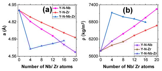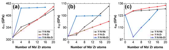 In Figure 4a, the curves for Y-N-Nb and Y-N-Zr for are almost equal, while that for Y-N-Nb-Zr experiences a drastic rise at Nb = 4 and then rises slowly as the number of Nb atoms increases. For (Figure 4b), the curve for Y-N-Nb rises higher than that for Y-N-Zr as the number of Nb/Zr increases, implying that there is closer packing between the atoms in the Y-N-Nb structure than the packing between the Y-N-Zr structure. The Y-N-Nb-Zr structure also experienced a drastic rise at Nb = 4 for and then rose slowly as the number of Nb atoms increased (Figure 4b). In Figure 4c, the curves of for both Y-N-Nb and Y-N-Zr are comparable, especially at low values of Nb/Zr. As the values of Nb/Zr increase, however, a deviation is observed. This implies that Zr contributes to higher values of the stiffness constant . The drastic drop in for Y-N-Nb-Zr at Nb = 4 indicates that the sample experiences the least stiffness at this value of Nb.
