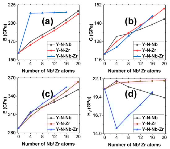 Figure 4a shows the variation in the elastic stiffness constants of the samples with the number of Nb/Zr atoms. As the figure depicts, a consistent increase in with the number of Nb/Zr is observed in all the samples, while the Y-N-Nb-Zr experienced a drop at Nb = 4 but then increased as the number of Nb increased. The increase in the stiffness constants can be attributed to the close-packed arrangement of the atoms in their structures. Elevated stiffness constant values in materials are noteworthy for multiple reasons since they greatly influence the material’s mechanical properties and appropriateness for different uses. Characterizing a material’s reaction to mechanical loads and deformations requires an understanding of the stiffness constants. The fact that materials with greater stiffness constants are less pliable and more rigid is the most obvious significance. They are more difficult to stretch or compress under a given force and resist deformation. This property is essential in applications that demand dimensional stability. Moreover, stiffer materials can bear more loads and pressures without experiencing undue deformation or failure. Because of this, they can be used in load-bearing parts in equipment, buildings, and other applications []. All the materials computed in this study therefore prove to be superior to YN since all have higher values of the elastic stiffness constants.
