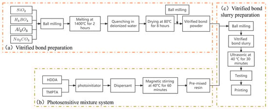 The solid dispersant was dissolved in ethanol using magnetic stirring in a water bath at 40 °C. A pure vitrified bond slurry with a solid content of 40 wt.% was prepared to explore the optimal slurry system. Firstly, HDDA and TMPTA were mixed in a specific ratio (based on extensive experiments, an HDDA-to-TMPTA ratio of 67:33 was found to ensure the desired molding quality and minimize the mixture’s viscosity) through magnetic stirring for 30 min. To fully cure, five wt.% TPO photoinitiator was added to the mix relative to the resin content [33]. Subsequently, dispersants, including PEG (with molecular weights of 200, 400, 800, 1000, and 2000), OA, SA, SS, and SC, were added to the mixture, followed by magnetic stirring for 60 min to obtain a photosensitive mixed system, as shown in Figure 1b. Finally, the mixture was combined with the vitrified bond powder and ball-milled in a vacuum ball mill at 300 r/min for 2 h. Afterward, bubble elimination was carried out using ultrasound at 40 °C for 30 min to remove bubbles from the vitrified bond slurry, resulting in a well-dispersed photosensitive vitrified bond slurry with different viscosities, as illustrated in Figure 1c. Once the optimal slurry system was determined, the abrasive could be added according to the same method, and the slurry system composed of vitrified bond and abrasive could be configured.