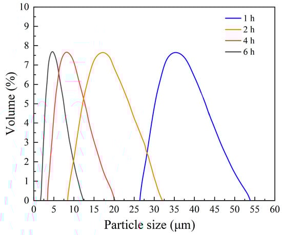 Figure 3 shows the effect of different ball-milling times on the particle size of the vitrified bond. It was observed that as the milling time increased, the particle size gradually decreased. The d50 values of the vitrified bond were approximately 36.2 μm, 17.8 μm, 9.2 μm, and 4.8 μm for milling times of 1 h, 2 h, 4 h, and 6 h, respectively. It shows that prolonging the ball-milling time increases the number and energy of collisions between the balls and particles, which favors more particles breaking, thus reducing the particle size.