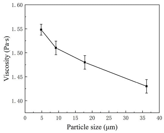 The different particle sizes of the vitrified bond were mixed uniformly with the pre-prepared photosensitive mixture system (without dispersant) and ball-milled for 2 h to obtain the vitrified bond slurry. The effect of different particle sizes on the viscosity of the slurry was compared through rheological analysis, as shown in Figure 4. It was found that for vitrified bonds with d50 values of 36.2 μm, 17.8 μm, 9.2 μm, and 4.8 μm, the viscosities of the slurry at a shear rate of 30 s−1 were 1.42 Pa·s, 1.47 Pa·s, 1.50 Pa·s, and 1.54 Pa·s, respectively. This is because as the particle size decreases, the specific surface area of the particles increases, resulting in higher slurry viscosity. Combined with Figure 1, although the viscosity of the slurry system was lowest when the particle size d50 was 36.2 μm for 1 h of ball milling, some of the particles exceeded the thickness of the slicing layer by 50 μm, which might damage the equipment when printing, so a particle size d50 of 17.8 μm was selected for a ball-milling time of 2 h.