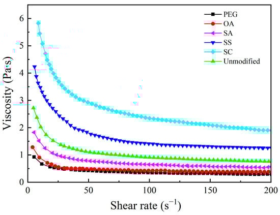 Vitrified bond diamond wheels must possess sufficient strength to meet the demands of the grinding process, which requires a good dispersion of the bond and abrasive in the slurry. If the dispersibility is not good, there will be fewer raw materials and more resin in a particular area during the printing process, leading to defects during sintering. Therefore, to obtain a well-dispersed slurry, we investigated the effects of five dispersants on the viscosity of the slurry, taking into account existing research reports [27,28,29,36,38,39,40], and we set up a control group without any dispersant. The results are shown in Figure 5. It was found that PEG with a molecular weight of 200, OA, SA, SS, and SC (added at 5.0 wt.% relative to the powder weight) as dispersants, as well as the control group without dispersant, all exhibited shear-thinning behavior. This indicates that all five dispersants and the control group meet the minimum requirements for printing. At a shear rate of 30 s−1, the viscosity of the slurry with the five dispersants was 0.48 Pa·s, 0.52 Pa·s, 0.92 Pa·s, 2.22 Pa·s, and 3.42 Pa·s, respectively, while the viscosity of the slurry without dispersant was 1.47 Pa·s. When PEG was used as a dispersant, the slurry exhibited the lowest viscosity, indicating its ability to effectively reduce particle collisions resulting from Brownian motion and minimize the friction between particles, thereby reducing the viscosity. On the other hand, SS and SC, when used as dispersants, have a viscosity beyond that of the slurry without dispersant, indicating their tendency to promote particle aggregation and collision without effectively reducing the slurry viscosity.