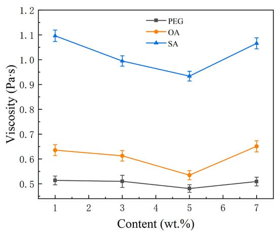 Considering the significant effect of PEG with a molecular weight of 200, OA, and SA in reducing the viscosity of the slurry, the influence of their addition at various concentrations on the slurry viscosity was compared. The concentrations tested were 1.0, 3.0, 5.0, and 7.0 wt.% (relative to the total weight of the powder), as illustrated in Figure 6. The research revealed that with an increase in the content of these three dispersants, the viscosity of the slurry showed a decreasing trend followed by an increasing trend; the minimum value of viscosity was obtained at an addition level of 5.0 wt.%. This indicates that when the concentration of the dispersant is too low, not all vitrified bond particles in the slurry are fully adsorbed by the dispersant, leading to ineffective modification. Due to the particle collisions resulting from Brownian motion, the particles not covered by the dispersant tend to agglomerate, resulting in poor dispersion and high viscosity. The dispersant forms a network structure within the slurry at an appropriate concentration. It creates an organic protective layer on the particle surfaces, preventing particle collisions and improving dispersion, thereby reducing viscosity—however, there are many free dispersant bridges and crosslinks between the particles at high dispersant concentrations. According to the DLVO theory [41], bridging can cause flocculation, increasing the internal friction of the slurry and reducing its stability, leading to an increase in viscosity. Therefore, PEG as a dispersant at a concentration of 5.0 wt.% is more suitable.