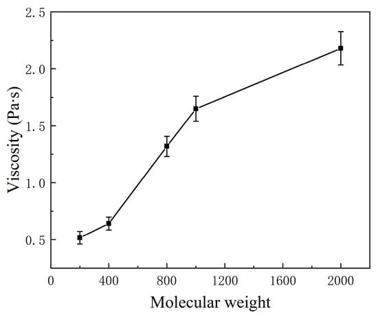 To determine the effect of molecular weight on the viscosity of the vitrified bond slurry, PEG with molecular weights of 200, 400, 800, 1000, and 2000 was investigated, as shown in Figure 7. The study revealed that as the molecular weight increased, the viscosity of the slurry also increased. At a shear rate of 30 s−1, the viscosities were measured to be 0.48, 0.60, 1.26, and 2.07 Pa·s for PEG with molecular weights of 200, 400, 800, and 1000, respectively. This can be attributed to the fact that as the molecular weight of the dispersant increases, the molecules become longer and heavier, leading to a more complex spatial arrangement between the molecules. The intermolecular forces, such as van der Waals forces and electrostatic attraction, among these molecules increase the tendency of the dispersant molecules to aggregate within the slurry. This aggregation increases the intermolecular friction within the slurry, increasing viscosity. Therefore, PEG with a molecular weight of 200 is more suitable as a dispersant.