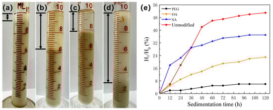 The stability of vitrified bond slurry can be primarily measured through sedimentation tests. The prepared slurry is placed in a 10 mL graduated cylinder, and the height of the supernatant liquid (H1) and the initial size of the slurry (H0) are recorded every 12 h. The value of H1/H0 is then calculated, and a lower value of H1/H0 indicates higher slurry stability. To obtain a well-stabilized vitrified bond slurry, the effects of three dispersants that significantly reduced the viscosity of the slurry, PEG with a molecular weight of 200, OA, and SA (added at 5.0 wt.% relative to the total weight of the powders), were compared with the effects of a blank control group with no dispersant on the stability of the slurry, as shown in Figure 8. Figure 8a, 8b, 8c and 8d represent the sedimentation behavior of slurry samples with PEG, OA, SA, and no dispersant, respectively, after 120 h of sedimentation. At the same time, Figure 8e shows the H1/H0 values. This study revealed that after 120 h of sedimentation, the supernatant liquid (H1) heights for the four dispersants were 1.6, 3.7, 2.9, and 7.5 mL, respectively. As a dispersant, PEG exhibited the smallest H1/H0 value, which maintained the best stability of the slurry. This can be attributed to the excellent coverage of the PEG molecular chains on the surface of the vitrified bond particles, effectively reducing the contact and collision between the particles, resulting in slower sedimentation of the slurry. The slurry system without a dispersant showed the maximum height of the supernatant liquid in a short period, indicating severe aggregation and flocculation. This led to solid sedimentation and a faster sedimentation rate, making the slurry the least stable.