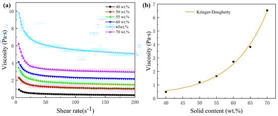 To obtain a vitrified bond slurry with high solid content and low viscosity, we investigated the rheological performance of the slurry with PEG of molecular weight 200 (added at 5.0 wt.% relative to the total weight of the powder) as a dispersant and different solid contents, as shown in Figure 9. Figure 9a illustrates the variation in slurry viscosity with shear rate. It was found that the slurry viscosity gradually decreased as the shear rate increased from 1 s−1 to 200 s−1. This indicates that the slurry with different solid contents exhibits shear-thinning behavior and good dispersion. Many researchers have found this phenomenon [27,28]. Figure 9b is a scatter diagram of the viscosity of the slurry with different solid contents at a shear rate of 30 s−1. The viscosity of the slurry is 0.48, 1.2, 1.65, 2.72, 3.82, and 6.53 Pa·s when the solid content is 40, 50, 55, 60, 65, and 70 wt.%. The red curve represents the Krieger–Dougherty model curve, which reflects the relationship between slurry viscosity and solid content [42]. As the solid content increases, the slurry viscosity increases significantly, and the trend of viscosity change aligns well with the model curve. The viscosity increase is most pronounced when the solid content increases from 65 wt.% to 70 wt.%, indicating that at higher substantial ranges, more severe clustering occurs within the slurry. This clustering, along with sedimentation effects, prevents the interlayer flow of the slurry even at high shear rates, resulting in a sharp increase in viscosity. Therefore, adding 5 wt.% PEG with a molecular weight of 200 and a solid content of 65 wt.% (approximately 45.5 vol.%) is most suitable. Compared with other research on the solid content of slurry, this experiment has made great progress [35,43].