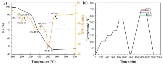 After sintering, a two-step process was employed to obtain defect-free vitrified bond diamond grinding wheels. Firstly, debinding was performed in a vacuum environment to ensure the slow pyrolysis of organic materials and avoid generating defects. After debonding, oxygen was introduced for sintering in an ambient air environment to react with the residual carbon and eliminate impurities to the maximum extent. Previous studies have reported the pyrolysis temperatures of the photopolymer resins HDDA and TMPTA to be approximately 290 °C and 200 °C [35,43], while the pyrolysis temperature of PEG is about 300 °C. Based on the thermogravimetric analysis of the preforms (40 wt.% solids, 5.0 wt.% molecular weight 200 PEG), a slow debonding process was established, as shown in Figure 10. During the debinding stage, the temperature was held at 200, 300, 370, and 550 °C for 120 min at a rate of 1 °C/minute and 370–550 °C at a rate of 2 °C/minute. During the sintering stage, a heating rate of 2 °C/min was applied, followed by holding temperatures of 600 °C, 630 °C, 650 °C, 680 °C, and 700 °C for 150 min, as depicted in Figure 10b. After cooling to room temperature, defect-free vitrified bond diamond grinding wheels were obtained.
