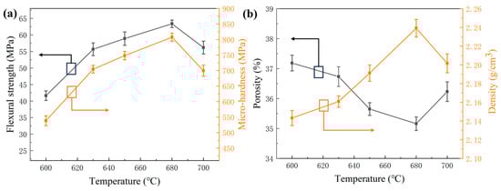Vitrified bond at different sintering temperatures: (a) flexural strength and micro-hardness; (b) density and porosity.