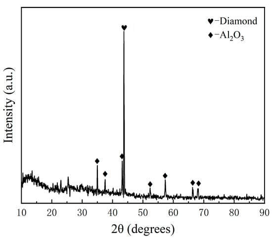Figure 14 shows the X-ray diffraction pattern of the grinding wheel at a sintering temperature of 680 °C. This study reveals the presence of a glass phase in the phase composition of the grinding wheel, indicating the amorphous structure of the vitrified bond. The main component of white corundum is Al2O3. In the spectrum, diamond and Al2O3 represent the grinding wheel’s primary and auxiliary abrasive. The high-temperature sintering of diamond occurs without any occurrence of graphitization when adequately encapsulated by the vitrified bond.