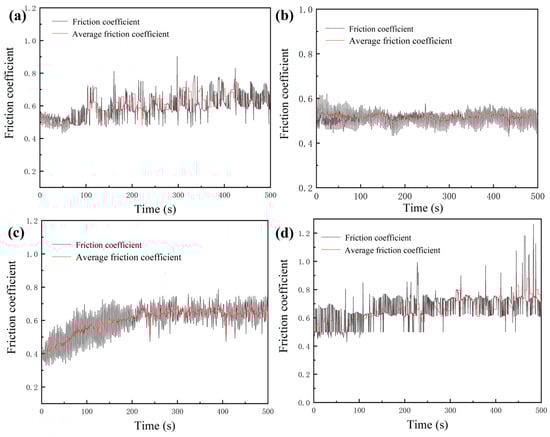 Relationship between friction coefficient and grinding time for grinding silicon carbide ceramics with four sets of grinding wheels: (a) R2; (b) R3; (c) R4; (d) R5.
