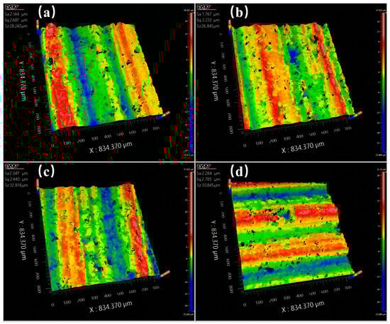 The surface morphology of the silicon carbide workpieces after grinding with the four grinding wheels was examined using a white light interferometer, as shown in Figure 17. In the image, the red color represents surface protrusions, the blue color represents surface depressions, and the green color represents relatively flat areas. This study found that the average surface roughness Sa of the workpieces after grinding with the four sets of grinding wheels was 2.144 μm, 1.767 μm, 2.047 μm, and 2.284 μm, respectively. The surface roughness depends mainly on the abrasive grain size. The surface roughness difference was insignificant since the diamond particle size used in the four sets of grinding wheels was the same. However, a detailed analysis revealed that the R3 grinding wheel exhibited the lowest surface roughness and the best surface flatness. It had fewer depressions and protrusions. This can be attributed to the higher flexural strength and sharper cutting edges of the wheel, resulting in better self-sharpening. When grinding hard and brittle materials, a shorter wheel tends to produce lower surface roughness on the workpiece. From the grinding experiment, the grinding performance of the grinding wheel meets the daily processing.