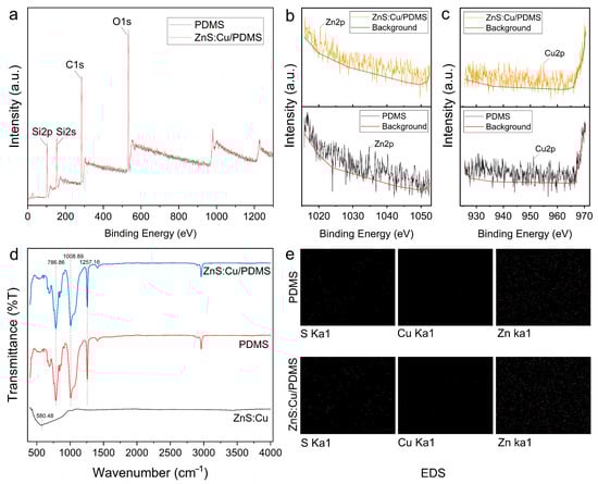 (a) XPS survey and (b,c) narrow spectra of PDMS and ZnS:Cu/PDMS. (d) FT-IR spectra of ZnS:Cu, PDMS, and ZnS:Cu/PDMS. (e) EDS measurement of PDMS and ZnS:Cu/PDMS.