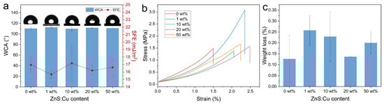 (a) WCA and SFE measurements. (b) Stress–strain curves of the samples. (c) Weight loss in the samples.