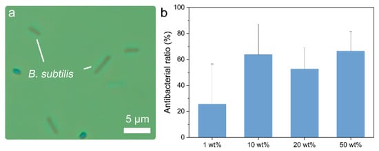 (a) Optical microscopic image of B. subtilis. (b) Antibacterial ratios of the samples.