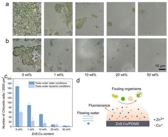 The antifouling tests against Chlorella were conducted under static and dynamic conditions. In the static tests (Figure 5a), many Chlorella cells covered the 0 wt% sample. Among the samples with ZnS:Cu contents, the 1 wt% and 10 wt% samples showed several Chlorella colonies, whereas the 20 wt% and 50 wt% samples showed only a few scattered Chlorella cells. According to the quantized data in Figure 5c, the antifouling capability of the samples increased with increasing ZnS:Cu content. This variation trend was different from that observed in the antibacterial tests, indicating that the ZnS:Cu particles have a selective antifouling capability. In the dynamic tests, the antifouling capability of the samples increased with increasing ZnS:Cu content. The numbers of Chlorella cells on the 0 wt%, 1 wt%, and 10 wt% samples were significantly decreased in the dynamic tests (Figure 5b) compared with those in the static tests (Figure 5a), and the numbers of Chlorella cells on the 20 wt% and 50 wt% samples showed a reduction to some extent. There are several mechanisms underlying these results in the dynamic tests. First, ZnS:Cu particles may have a high release ratio in flowing water. Second, deformation is more likely to occur on the ZnS:Cu/PDMS surface than on the pristine PDMS under the impact of water flow; thus, fouling organisms can easily detach from the surface during continuous deformation. Thirdly, surface deformation may induce fluorescence to prevent the settlement of Chlorella. Hence, the samples exhibited better antifouling capabilities under dynamic conditions than under static conditions. A schematic illustration of the antifouling mechanisms of the ZnS:Cu/PDMS coatings is shown in Figure 5d. According to these tests, the 50 wt% sample exhibited the best antifouling capability. Although coatings with a higher ZnS:Cu content (e.g., 60 wt%) may have better antifouling capabilities, this can lead to a significant increase in costs. Hence, the 50 wt% sample is a good candidate for practical applications.