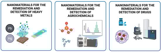 Nanotechnology has provided us with a platform with various applications to increase a sustainable environment for present generations and thus be able to carry out future research. Nanomaterials have been incorporated into these lines of study and have proven highly compatible with applications in contaminants and toxic chemical detection from natural environments [6,7]. In general, materials on the nanometric scale have optical, electrical, and mechanical properties that are not observable on the macro (or bulk) scale [8,9], allowing the creation of sensors with faster detection, better specificity, catalysis, and better quality of the transduction signal. Further, as nanomaterials present a high ratio of their surface-area-to-volume ratio, they are also appropriate for wastewater remediation processes [10]. This review discusses the importance of various nanomaterials for detecting and remediating pollutants as an alternative to traditional methods, considering the sustainability of such materials, their ability to be reused or recycled, and their specificity towards the target analytes. In that regard, our motivation to write this review resides in the potential applicability of nanomaterials to overcome the pollution crisis in the foreseeable future. However, despite their enormous potential, nanomaterials also present a fair number of challenges, which will also be addressed in this review to provide insight and strategies for researchers who might indulge in pollutant treatment using nanostructures. Finally, the remediation and detection of pollutants using nanotechnology will be discussed in three categories, as described in Figure 1.