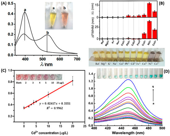 Nanomaterials for the colorimetric detection of heavy metals. The nanomaterial-analyte interaction is confirmed through changes in the state of the nanomaterial: Absorption spectra of the CCA-AgNPs probe before (a) and after (b) interaction with Cd(II) (A) [24]. The colorimetric aspect of 3-MPS-AgNPs upon interaction with different metal ions. Changes in the SPR absorption band and the full width at half maximum (FWHM) are also illustrated (B) [27]. Colorimetric response of an aptamer-AuNPs system at increasing Cd (II) concentrations (C) [42]. Absorption spectra and colorimetric response of MT-CuNPs (450 nm) at different Pb (II) concentrations (D) [39].