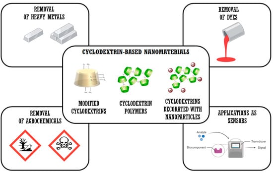 - Liu, Q.; Zhou, Y.; Lu, J.; Zhou, Y. Novel cyclodextrin-based adsorbents for removing pollutants from wastewater: A critical review. Chemosphere 2020, 241, 125043. [Google Scholar] [CrossRef]