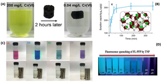 Cr (VI) treatment has also been explored using cellulose nanocrystals (CNCs). A chitosan/CNCs/carbon dots nanocomposite was formed by Zeng et al. [56], who assembled a porous structure to detect and remove Cr (VI). Carbon dots provided adsorption sites for the matrix, exhibiting an adsorption capacity of 218.8 mg/g. Further, the nanocomposite acted as a fluorescent probe for quantitatively detecting Cr (VI) with an LOD of 40 ng/L.