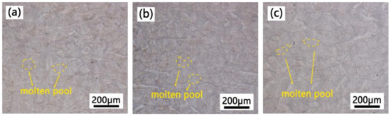 OM images on build direction of the as-deposited IN718 samples: (a) S1, (b) S2, (c) S3.