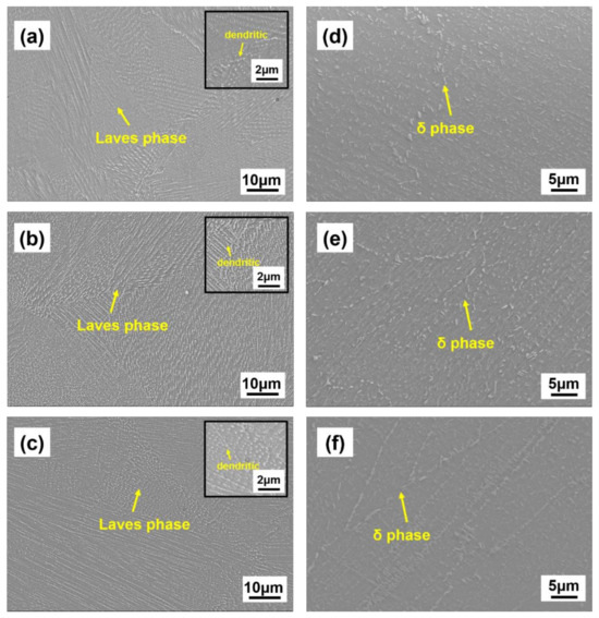 The segregation of elements (Nb, Mo, Ti) in IN718 alloy leads to the formation of a large number of Laves phases between the molten layers of the alloy [7,27]. The interdendritic region was particularly susceptible to the formation of the Laves phase, as shown in Figure 4a–c. The Laves phase typically measured 1–2 μm in length, and its chemical formula was (Ni, Fe, Cr)2(Nb, Mo, Ti) [28]. The Laves phase would dissolve and transform into the δ phase after heat treatment. The microstructures of the samples post heat treatment are presented in Figure 4d–f. The δ phase was visible in both needle-like and short rod-like shapes. Moreover, the δ phase generally had a size of 0.5–1 μm and a chemical formula of Ni3Nb in the IN718 alloy [29]. Using Image J software (v1.53), the volume fraction of the Laves and δ phase was determined through statistical analysis (Figure 5). The volume fractions of the Laves phase in different VED samples were calculated to be 6.35%, 7.75% and 9.86%, respectively. After undergoing heat treatment, the respective volume fractions in the δ phase in the three samples were 4.74%, 5.54%, and 7.83%, respectively. The volume fractions of both Laves and δ phases increased with an increase in VED.