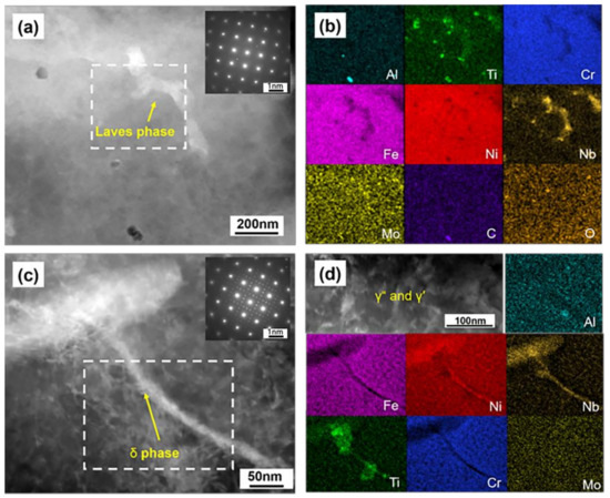 To compare element distribution and precipitate morphologies in the as-deposited and heat-treated samples, we selected S2 and H-S2 for TEM observation. High-angle annular dark field (HAADF) TEM micrographs for the Laves and δ phases appear in Figure 6a,c, respectively. High-density entangled dislocations were found in the intergranular boundaries and matrix regions of S2, in addition to precipitates. The distribution of the main elements can be observed in Figure 6b,d using X-ray energy dispersive spectroscope (XEDS) elemental mapping from the white dotted square. Continual segregation of Nb, Mo and Ti and numerous precipitates along the cellular boundary were observed in the as-deposited sample. However, in H-S2, partial dissolution of the Nb, Mo, and Ti segregation occurred after solution treatment, and the γ′/γ″ phases were precipitated during the aging stage. The entangled dislocations of high density vanished, resulting in a more uniform microstructure.