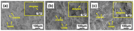 The fracture surfaces of three samples, as depicted in Figure 8, exhibited intergranular fracture. The mode of fracture was primarily brittle, and the fracture surface was plain, with small and shallow dimples observed in all three samples. As a result, the elongation of the three samples was limited. Micro-voids developed at the interface between the strengthening phase particles and the matrix, facilitating the generation of dimples.