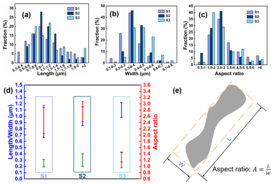 The statistical findings regarding Laves phases in the varied VED samples. (a) L (Length), (b) W (width), (c) aspect ratio, (d) the average length, width and aspect ratio of Laves phases, (e) the schematic parameter diagram of Laves phase.