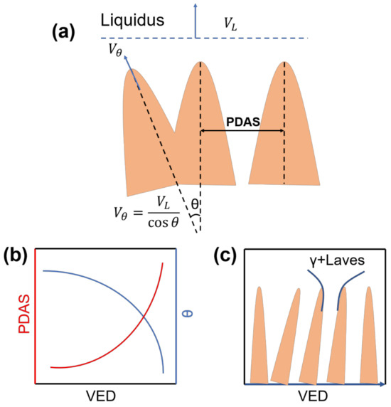 To better depict the progression of the Laves phases in the three sample types, the Image J software (v1.53) was employed to tally the lengths, widths and aspect ratios of the Laves phases. Figure 9 demonstrated the statistical findings, whereby the size of the Laves phase grew with increasing VED. The length increased at a slower rate than the average width of the Laves phase, resulting in the aspect ratio of the Laves phase being the smallest in S3 (Figure 9d). The formation of the Laves phase occurred within the interdendritic region during solidification. The morphologies and distributions of the phase were determined primarily by the behavior of dendrite growth [30]. The conventional model for columnar dendrite grain growth suggests that dendrite orientation primarily depends on undercooling differences [31]. For the IN718 alloy, this direction was along its <001> crystallographic orientation, which formed the smallest angle with the local temperature gradient. Each dendrite arm had a misalignment angle θ relative to the temperature gradient (−45° ≤ θ ≤ 45° for the 2-D case), as presented in Figure 10a. The Vθ denoted the growth rate of the dendrite arm and was calculated by dividing VL (the velocity of the liquidus isotherm) by the cosine of θ. The cooling rate of molten materials was negatively correlated with the VED, thus a decreasing trend for the misalignment angle θ was shown in S1–S3. In addition, Equation (2) [32] was commonly used to determine the primary dendrite arm spacing (PDAS, measured in mm).