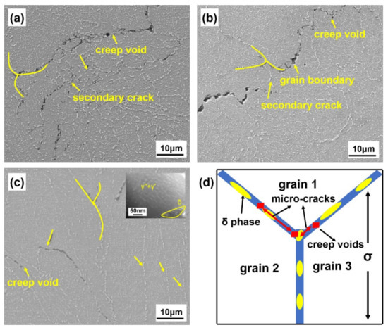The samples with different VED had an δ phase with different morphologies and sizes after heat treatment. The stress rupture properties were significantly affected by the volume fraction, distribution, and morphologies of the δ phase. As can be seen from Figure 12, the influence of δ-relative durability can be divided into three situations: (1) the δ phase acted as the source of the crack, (2) the crack propagated along the accumulated δ phase, (3) the δ phase affected the precipitation in the γ″ phase, causing cracks. In this investigation, the ratio of the creep temperature (T) to the melting point (Tm) of the IN718 alloy was roughly 0.5. Creep voids had the ability to form and develop at grain boundaries when the T/Tm ratio ranged from 0.3 to 0.6 [19]. Creep voids were found surrounding the δ phase, which was distributed along the grain boundaries, as illustrated in Figure 12a–c. The growth, connection and coalescence of these creep voids resulted in the development of microcracks along the grain boundaries. Furthermore, crack extension could occur at the junction of different grain boundaries due to a disordered atomic arrangement, as shown in Figure 12d.