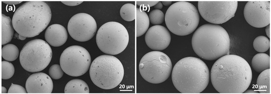 SEM images of the (a) FeNbBSiCrNi and (b) FeNbBSiCrNiMo metallic powders.