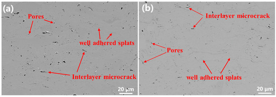 An SEM image of the powders of FeNbBSiCrNi and FeNbBSiCrNiMo is shown in Figure 1. It is seen that the powders are spherical or nearly spherical with smooth surfaces, demonstrating a good fluidity, which is conducive to the stability of the spraying process and the uniformity of the coating. The cross-sectional morphologies of both coatings are shown in Figure 2, both of which exhibit a uniform structure. Significant deformation was caused as the heated particles impacted rapidly on the surface of the substrate or the deposited particles during the HVAF process. The particles’ shape changed from spherical to lamellar after deposition. The main structural defect of HVAF sprayed coatings is the interlayer porosity, which is due to the formation of some non-contact areas among two deformed lamellar structures during the spraying process. As clearly displayed in Figure 2, the FeNbBSiCrNiMo coating contains fewer and smaller pores, as the porosity of the FeNbBSiCrNi coating and the FeNbBSiCrNiMo coating were calculated to be 2.26% and 1.53%, respectively. This indicated that the 4 at. % Mo addition improves the compactness of the coating.