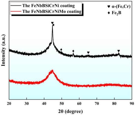 Among Fe-based amorphous alloys, Fe-(B, Si)-Nb amorphous alloys are receiving more attention due to their high GFA, excellent corrosion resistance, and fairly low cost [16,17]. Based on the Fe-(B, Si)-Nb system, the authors’ group has been dedicated to its component optimization to further improve its corrosion resistance and GFA. The addition of minor alloying elements is a well-known method in component optimization of Fe-based amorphous alloys, and Cr, Ni, and Mo are three common alloying elements. Among them, Cr is crucial to further improve the corrosion resistance, because it can form a dense passive film on an alloy’s surface to prevent further erosion of the internal alloy by the corrosive medium [17,18]. Additionally, Ni can improve the forming ability of Fe-based amorphous alloys, because it belongs to the same period as Fe with the adjacent position in the periodic table, sharing similar atomic radii, outer electronic structures, and physicochemical properties with Fe. Similar atomic substitution can improve the chaos of amorphous alloy systems [4,19]. Therefore, Ni and Cr elements were added to the Fe-(B, Si)-Nb amorphous alloy system to form the FeNbBSiCrNi alloy. In addition, Mo has been found to be effective in the regulation of composition to improve the corrosion resistance and GFA of Fe-based amorphous alloys [17,20]. However, the role of Mo in the FeNbBSiCrNi system is not clear and needs further study. In order to better understand the factors affecting the GFA and the corrosion resistance of coatings through micro-alloying, the focus of the current work is to explore the effect of adding a small amount of Mo on FeNbBSiCrNi amorphous coatings.
