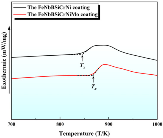 The XRD patterns of the Fe-based coatings are shown in Figure 3. The presence of broad diffraction peaks as well as α-(Fe, Cr) and Fe2B crystalline phases in the FeNbBSiCrNi coating suggests that the coating is an amorphous/crystalline composite structure. The amorphous content of the coating was estimated to be about 87.5% based on the area ratio of the crystalline peaks to the amorphous peaks, while the FeNbBSiCrNiMo coating merely exhibits a broad diffraction peak without any crystalline phase peaks, illustrating a single amorphous structure of the as-sprayed Mo-containing coating. The addition of a minor amount of Mo changes the phase structure of the Fe-based coating and increases the amorphous content of the coating, and the higher amorphous content indicates better corrosion resistance of the Mo-containing Fe-based coating [20]. Figure 4 shows the DSC curves of the coatings. The presence of amorphous structures in both coatings is further evidenced by the obvious crystallization-induced heat absorption peaks in the curves. The onset crystallization temperature (Tx) can be taken as a criterion to compare the relative thermal stability of the two Fe-based coatings. The higher the Tx, the better the thermal stability of the coating [21]. The Tx of the FeNbBSiCrNiMo coating is about 20 K higher than that of the FeNbBSiCrNi coating, indicating that the addition of minor Mo significantly improved the thermal stability of the Fe-based coatings, as reported in the study by Zhang et al. [17]. The 4 at. % Mo addition enhanced both the GFA and the thermal stability of the Fe-based coating while inhibiting crystallization.