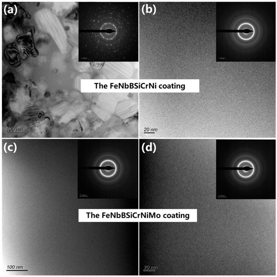 TEM images of the coatings. (a,b) The FeNbBSiCrNi coating and (c,d) the FeNbBSiCrNiMo coating.