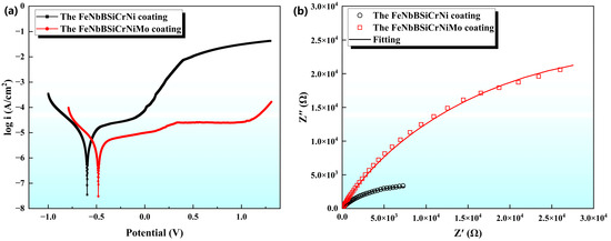 To evaluate the impact of a small Mo addition on the corrosion resistance of Fe-based coatings, potentiodynamic polarization behaviors and EIS tests were performed on FeNbBSiCrNi and FeNbBSiCrNiMo coatings, and the results are shown in Figure 6. The self-corrosive potential (Ecorr) responds to the ease with which the material can be corroded, and the self-corrosive current density (Icorr) responds to the actual corrosion rate of the material [26]. From Figure 6a, it can be seen that with the addition of minor amounts of Mo, the Ecorr of the Fe-based coatings increased from −597 mV to −491 mV, and the Icorr decreased from 4.44 μA/cm2 to 3.78 μA/cm2. The polarization resistance (Rp) was calculated according to the Stem-Geary formulation as follows [27]: