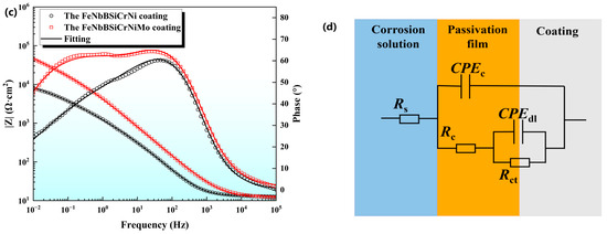 The EIS test was studied to further understand the influence of minor Mo additions to Fe-based coatings on corrosion resistance. The Nyquist plots and Bode plots are shown in Figure 6b,c, respectively. The corrosion resistance is related to the arc radius of the Nyquist plots [29]. A larger radius is observed in the FeNbBSiCrNiMo coating, indicating its higher corrosion resistance. In addition, a higher phase angle value for FeNbBSiCrNiMo confirms its superior corrosion properties. Based on the above analysis, an equivalent electrical circuit to describe the electrochemical cell for all the glassy coatings is proposed and shown in Figure 6d, which was used in EIS data fitting, and the fitting parameters are displayed in Table 3. Rs is the solution resistance; Rc and Rct are the coating resistance and charge transfer resistance, respectively. Since the coating surface shows an absence of perfect smoothness and exhibits defects like porosity and roughness, the constant phase angle element CPE was used instead of ideal capacitance. Qc and Qdl are the coating capacitance and electric double-layer capacitance, respectively; nc and ndl are the dispersion coefficients of Qc and Qdl away from the pure capacitance, respectively [30]. Similar ionic conductivity is indicated by a slight variance in Rs values between the two coatings. The nc and ndl values for both coatings are less than one, indicating that the coating exhibits nonideal capacitance behavior as a result of its surface heterogeneities. The Qc value and passive film thickness are inversely correlated, decreasing the Qc value as the passive film thickness increases [31]. The lesser Qc value of the FeNbBSiCrNiMo coating points out that a relatively thicker passive film is formed. Additionally, a lesser corrosion area is indicated by a lower value of Qdl for the FeNbBSiCrNiMo coating. The correlation between the Rc and Rct values along with the material’s corrosion resistance is positive [32]. The FeNbBSiCrNiMo coating has a relatively high Rc value, indicating that the degree of being corroded is small, and a high Rct value, indicating that charge transfer is difficult during the reaction. FeNbBSiCrNiMo coatings’ higher Rc and Rct values provide additional evidence of their excellent corrosion resistance.