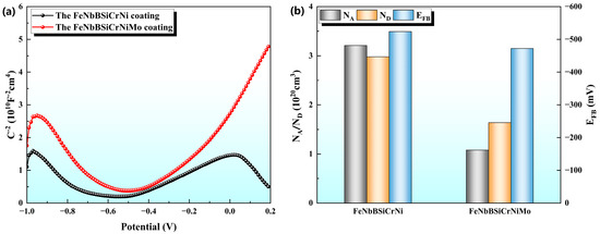 Figure 7b shows the NA, ND, and EFB values of the passive film formed on Fe-based coatings, calculated from Equations (2) and (3), and the slope of the linear regions of the M-S plots. A higher EFB value of the FeNbBSiCrNiMo coating indicates a higher energy barrier, more difficult electron transfer, and more stable passive films formed [33]. In general, a higher NA value indicates faster electron transfer rates at the passive film–electrolyte interface, and a higher ND value indicates more oxygen vacancies in the passive film and the corrosive Cl− is adsorbed more easily [36]. The NA values of FeNbBSiCrNi and FeNbBSiCrNiMo coatings are 3.21 × 1020 cm3 and 1.08 × 1020 cm3, and the ND values are 2.98 × 1020 cm3 and 1.64 × 1020 cm3, respectively. The higher NA and ND values of the FeNbBSiCrNi coating indicate that the passive film has more defects and deterioration of the corrosion resistance. The lower NA and ND values in the FeNbBSiCrNiMo coating indicate the formation of a denser passivation film with fewer defects and better protection of the substrate. Therefore, the addition of minor amounts of Mo reduces the defects in the passive film and improves the corrosion resistance of Fe-based coatings.