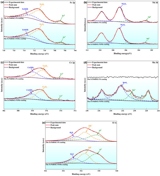 High-resolution XPS spectra of (a) Fe 2p, (b) Nb 3d, (c) Cr 2p, (d) Mo 3d, and (e) O 1s. Comparison of the chemical composition of passive film of the coatings.