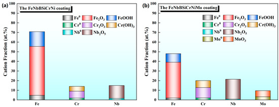 Cation fraction in the passive film of the coatings obtained by XPS analysis: (a) FeNbBSiCrNi coating; (b) FeNbBSiCrNiMo coating.