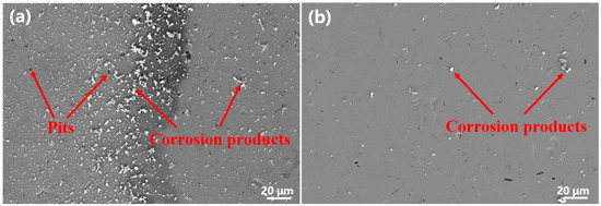 SEM images of the surface of the (a) FeNbBSiCrNi and (b) FeNbBSiCrNiMo coatings after an immersion corrosion test.