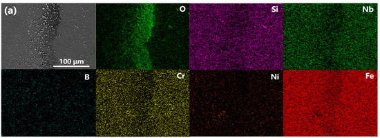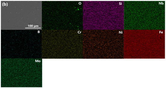 The surface morphologies of the Fe-based coatings after 12 h of immersion in 3.5 wt. % NaCl solution are shown in Figure 10. The FeNbBSiCrNi coating was discovered to have a large area of white flocculent corrosion products as well as a few pits (Figure 10a). In contrast, the surface of the FeNbBSiCrNiMo coating is relatively flat with only a few corrosion products, indicating that the addition of minor amounts of Mo reduces the damage to the coating. Figure 11 shows the Fe-based coating’s EDS images following the immersion test. Oxygen elements are abundant on the FeNbBSiCrNi coating’s surface, indicating the occurrence of severe oxidation behavior. In comparison, the FeNbBSiCrNiMo coating surface had only a few oxides, indicating excellent corrosion resistance. The results also demonstrate that a minor Mo addition is beneficial to improve the corrosion resistance of Fe-based coatings.