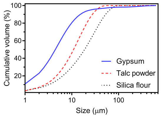 Particle size distribution of gypsum powder, talc powder, and silica flour.