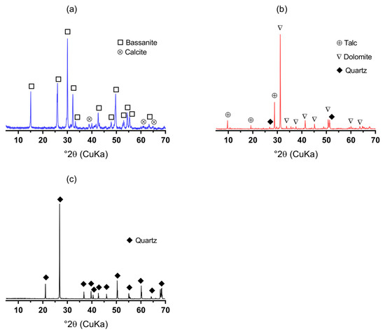 XRD pattern of (a) gypsum powder, (b) talc powder, and (c) silica flour.
