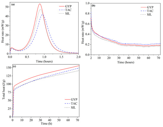 After about 10 h, as shown in Figure 3b, the TAC mixture exhibited the highest heat flow rate among the three (even higher than the pure gypsum mixture, GYP). The delayed hydration was the main reason for this phenomenon, and there was relatively more gypsum to hydrate after 10 h than in the other two mixtures. Figure 3c demonstrates the total related heat from the three mixtures during the 72 h of hydration. The TAC mixture started to generate more hydration heat than the SIL mixture at around the 25 h mark, continuing until the 72 h mark. This finding might reveal the role of talc powder in promoting the later-stage hydration of gypsum, possibly due to the release of absorbed water from talc that supported the continuous hydration of gypsum, similar to the well-known concept of internal curing in the field [32].