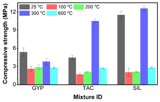 Figure 4 shows the compressive strength of gypsum pastes at elevated temperatures, with the standard temperature (25 °C) as the reference. The results at 1100 °C were unavailable because significant macrocracking formed in the specimen after the treatment. It can be seen that, at 25 °C, SIL samples had the highest strength among the three, more than twice that of GYP. The TAC samples had slightly lower compressive strength than the GYP samples. This result suggested that adding silica flour was influential in developing high-strength gypsum mixtures, possibly due to the higher hardness of silica than gypsum. Also, the average particle size of silica flour was bigger than that of gypsum, as shown in Figure 1. Thus, silica flour particles performed as a solid skeleton that increased the strength of the gypsum matrix [33]. Talc powder, however, was softer than gypsum, and, more importantly, it had physically adsorbed water on the particle surface due to its water-absorbing nature. Therefore, the interfacial region of talc and gypsum negatively influenced the strength of gypsum from this perspective.