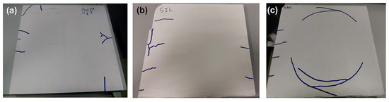 Microcracking in gypsum specimens after the 300 °C treatment: (a) GYP, (b) SIL, and (c) TAC.