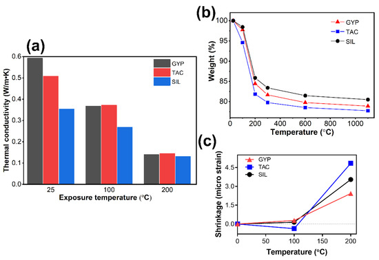 Figure 6b shows the weight loss of the gypsum specimens after treatment at elevated temperatures. Most weight losses happened before 300 °C, e.g., 15% at 200 °C and 20% at 300 °C, corresponding roughly to gypsum dihydrate becoming hemihydrate and then anhydrite. The weight loss amount from SIL specimens was the smallest among the three at all exposure temperatures, followed by the GYP and TAC specimens. The water absorption of talc powder was superior to that of silica flour in the gypsum mixtures and thus contributed to a much higher weight loss in the TAC specimens. Figure 6c shows the linear shrinkage of gypsum bar specimens after treatment at 100 °C and 200 °C. The shrinkage of the 300 °C treatment was unavailable because all the bar specimens broke after the heat treatment. At 100 °C, the GYP and SIL samples demonstrated a sensible shrinkage; however, the TAC specimens had no shrinkage but a slight expansion. This was possibly due to the rehydration of gypsum hemihydrate/anhydrite with the water harvested from the talc powder parallel to the dehydration [35]. At 200 °C, the TAC specimens shrank the most (due to a much more substantial water loss beyond gypsum dehydration) compared to the GYP and SIL specimens.