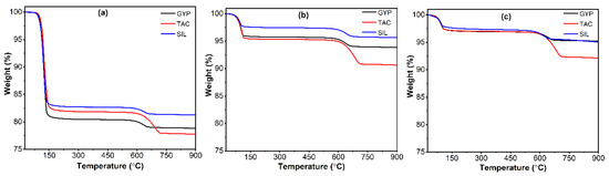 The GYP specimen had the most weight loss at 25 °C (without thermal treatment), followed by the TAC and SIL specimens, as shown in Figure 7a. This weight loss was attributable to gypsum dehydration and matrix-confined water. The GYP specimen contained the most gypsum hydrate, demonstrating the most weight loss among the three. In the SIL and TAC specimens, there was 10% of gypsum replaced by silica flour or talc powder, and thus the amount of gypsum hydrate was reduced (resulting in a decreased weight loss). The free water in the matrix likely evaporated during the curing of the specimens. The amount of matrix-confined water in the TAC specimen was higher than in the SIL specimen, as talc powder adsorbed water better than silica flour due to its smaller average particle size and stronger water affinity. After the thermal treatment at 200 °C and 300 °C (Figure 7b,c), the weight loss in the SIL specimen was still the lowest among the three, while the weight loss values in the TAC and GYP specimens were comparable. The reason might be the water confinement by talc during the dehydration of gypsum, so this amount of water contributed to the weight loss after the thermal treatment at 200 °C and 300 °C in the TAC specimen.